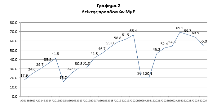 Παρόμοια εικόνα ενίσχυσης της απαισιοδοξίας καταγράφει και ο Δείκτης Προσδοκιών των ΜμΕ που υποχωρεί στις 55 μονάδες, εμφανίζοντας πτώση 8,9 μονάδων σε σχέση με το προηγούμενο εξάμηνο και 11,7 μονάδων συγκριτικά με το πρώτο εξάμηνο του 2023 (Γράφημα 2). Η κάμψη του δείκτη προσδοκιών των ΜμΕ αποτυπώνει την έντονη ανησυχία των επιχειρήσεων για την πορεία της οικονομίας και τη δυνατότητά τους να αντεπεξέλθουν στο επιχειρηματικό περιβάλλον που διαμορφώνεται.