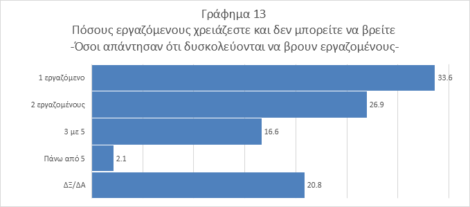 Σημαντικό εύρημα της έρευνας αποτελεί το αρνητικό ισοζύγιο που αποτυπώνεται όσον αφορά το ερώτημα κατά πόσον οι επιχειρήσεις αντιμετωπίζουν πρόβλημα στην εξεύρεση εργαζομένων, αναδεικνύοντας δομικά προβλήματα στην ελληνική αγορά εργασίας, όπως αυτό της «αναντιστοιχίας δεξιοτήτων». Πιο συγκεκριμένα, στο ερώτημα αυτό το 35,2% των επιχειρήσεων απάντησε ότι αντιμετωπίζει πρόβλημα, έναντι 34,6% που απάντησε ότι δεν αντιμετωπίζει πρόβλημα.