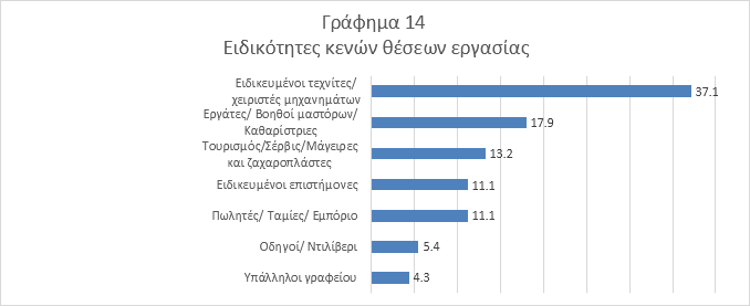 Αναφορικά με τις ειδικότητες που παρουσιάζουν έλλειψη στην αγορά εργασίας, οι ειδικευμένοι τεχνίτες/χειριστές μηχανημάτων (37,1%), οι εργάτες/βοηθοί μαστόρων και το προσωπικό καθαριότητας (17,9%), καθώς και οι ειδικότητες που σχετίζονται με τον τομέα του τουρισμού και της εστίασης (σερβιτόροι, μάγειρες και ζαχαροπλάστες) (13,2%) αποτελούν, κατά σειρά προτεραιότητας, τις τρεις σημαντικότερες κατηγορίες.