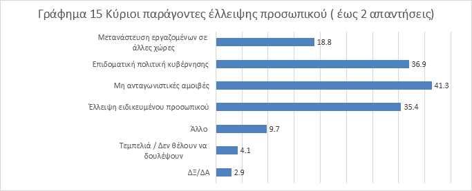 Αναφορικά με τους κυριότερους παράγοντες για τη έλλειψη προσωπικού στην αγορά εργασίας, οι επικρατέστερες απαντήσεις, σύμφωνα με τις επιχειρήσεις, αφορούν με σειρά προτεραιότητας τις μη ανταγωνιστικές αμοιβές (41,3%), την επιδοματική πολιτική της κυβέρνησης (36,9%), καθώς και την έλλειψη εξειδικευμένου προσωπικού (35,4%), ενώ σημαντικό είναι και το ποσοστό των επιχειρήσεων που έδωσε ως απάντηση τη μετανάστευση εργαζομένων σε άλλες χώρες (18,8%).