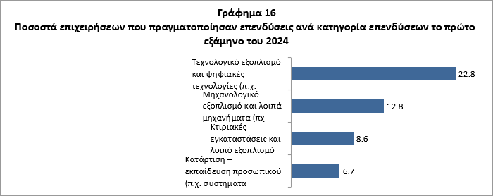 Το 22,8% των επιχειρήσεων πραγματοποίησε επενδύσεις σε τεχνολογικό εξοπλισμό και ψηφιακές τεχνολογίες, το 12,8% επενδύσεις σε μηχανολογικό εξοπλισμό και λοιπά μηχανήματα, το 8,6% σε κτιριακές εγκαταστάσεις και λοιπό εξοπλισμό και το 6,7% σε κατάρτιση και εκπαίδευση προσωπικού, ποσοστά μειωμένα σε σχέση με το προηγούμενο κύμα της έρευνας.