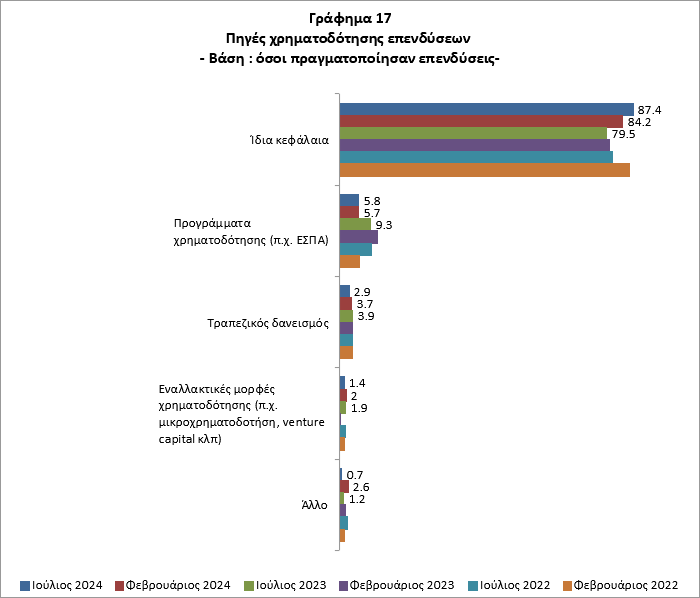 Το ζήτημα της πρόσβασης σε χρηματοδότηση για επενδύσεις εξακολουθεί να είναι σοβαρό. Συγκεκριμένα, σχεδόν 9 στις 10 επιχειρήσεις (87,4%) που επένδυσαν, χρησιμοποίησαν δικά τους κεφάλαια. Το 5,8% κάλυψε τις επενδύσεις μέσω χρηματοδοτικών προγραμμάτων (ΕΣΠΑ), ενώ μόλις το 2,9% χρηματοδοτήθηκε μέσω τραπεζικού δανεισμού.