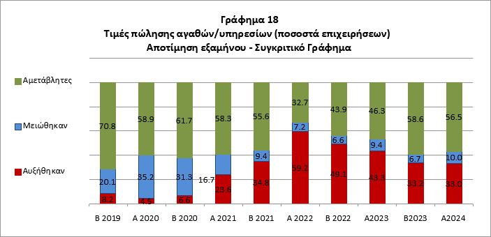 Η πορεία αύξησης των τιμών, μετά το ιστορικό ρεκόρ του 59,2% του πρώτου εξαμήνου του 2022 και τις ανατιμήσεις για το επόμενο έτος που εφάρμοσαν μία στις δύο επιχειρήσεις, παρουσιάζει ενδείξεις εξασθένισης, καθώς, τόσο στο δεύτερο εξάμηνο του 2023 όσο και στο πρώτο εξάμηνο του 2024, μία στις τρεις επιχειρήσεις αύξησαν τις τιμές τους. Συγκεκριμένα, η πλειονότητα των επιχειρήσεων (56,5%) διατήρησε τις τιμές προϊόντων ή υπηρεσιών σταθερές, έναντι του 33% που επέβαλαν αυξήσεις και ενός όχι αμελητέου 10% που μείωσε τις τιμές των προϊόντων. Σε κάθε περίπτωση όμως, το επίμονα υψηλό ποσοστό των επιχειρήσεων που αυξάνει τιμές αποδεικνύει ότι αναζητείται ακόμα το επίπεδο ισορροπίας της οικονομίας και σταθεροποίησης του πληθωρισμού.