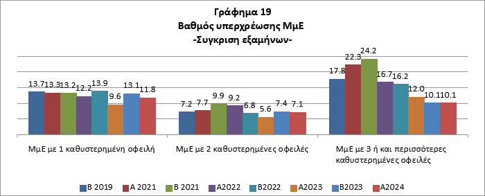 Όπως φαίνεται στο Γράφημα 19, από τη μια μεριά οι μικρές και πολύ μικρές επιχειρήσεις με 3 ή και περισσότερες ληξιπρόθεσμες οφειλές παραμένουν σταθερές στο 10,1%, ενώ, από την άλλη μεριά, υπάρχει οριακή υποχώρηση στα ποσοστά των επιχειρήσεων με 2 καθυστερημένες υποχρεώσεις (7,1% έναντι 7,4% το προηγούμενο εξάμηνο) και βελτίωση στο ποσοστό των επιχειρήσεων με 1 ληξιπρόθεσμη οφειλή (11,8% έναντι 13,1% το προηγούμενο εξάμηνο).