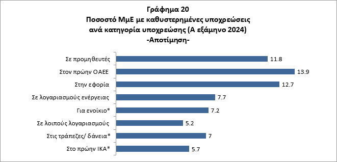 Η κατάσταση σχετικά με τα ποσοστά μικρών και πολύ μικρών επιχειρήσεων με καθυστερημένες οφειλές παρουσιάζει ελαφρά βελτίωση. Ωστόσο, το ποσοστό των επιχειρήσεων που δυσκολεύονται να καλύψουν τις υποχρεώσεις τους παραμένει ιδιαίτερα υψηλό, με το 29% να έχει τουλάχιστον μία ληξιπρόθεσμη οφειλή, παρουσιάζοντας μια μικρή μείωση σε σχέση με το προηγούμενο ποσοστό του 30,6%.