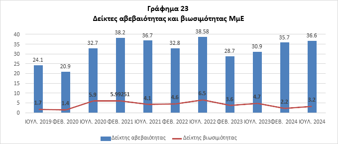 Οριακά ενισχύθηκε η απαισιοδοξία στις μικρές και πολύ μικρές επιχειρήσεις σχετικά με τη μελλοντική τους βιωσιμότητα, καθώς ο δείκτης αβεβαιότητας12 ανήλθε στις 36,6 μονάδες, καταγράφοντας αύξηση 0,9 μονάδων σε σχέση με το προηγούμενο εξάμηνο. Ειδικότερα, το 18,7% των επιχειρήσεων δήλωσε ότι είναι πολύ πιθανό να διακόψει τη λειτουργία του το επόμενο διάστημα, ενώ το 17,9% των επιχειρήσεων δήλωσε ότι είναι αρκετά πιθανό να διακόψει τη λειτουργία του το επόμενο διάστημα.