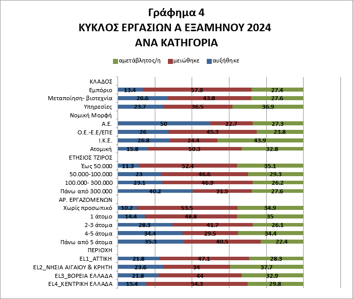 Από τα επιμέρους στοιχεία της έρευνας (Γράφημα 4) σχετικά με τον κύκλο εργασιών, διαφαίνεται μια συσχέτιση της εξέλιξης του κύκλου εργασιών με την εταιρική μορφή και το μέγεθος της επιχείρησης. Συγκεκριμένα, οι μισές Α.Ε. (50%) δήλωσαν ότι ο κύκλος εργασιών τους αυξήθηκε το πρώτο εξάμηνο του 2024, έναντι του 22,7% που διαπίστωσαν μείωση και του 27,3% του οποίου ο κύκλος εργασιών παρέμεινε αμετάβλητος. Αντίστροφη είναι η εικόνα για όλες τις άλλες εταιρικές μορφές (Ο.Ε.-ΕΕ,ΕΠΕ,ΙΚΕ, ατομικές επιχειρήσεις). Σχεδόν μία στις δύο Ο.Ε.-Ε.Ε.-ΕΠΕ (45,3%) δήλωσαν μείωση του κύκλου εργασιών και μόλις μία στις τέσσερις (26%) αύξηση. Πιο ισορροπημένη είναι η εικόνα των ΙΚΕ, για τις οποίες η αύξηση του κύκλου εργασιών υπερτερεί ελαφρώς των επιχειρήσεων που δήλωσαν μείωση, 26,8% έναντι 24,4% αντίστοιχα, ενώ ιδιαίτερα δυσχερής είναι η κατάσταση της ατομικών επιχειρήσεων (που αποτελούν και την πλειοψηφία των πολύ μικρών και μικρών επιχειρήσεων), από τις οποίες μόλις το 15,8% παρουσιάζει αύξηση του κύκλου των εργασιών, τη στιγμή που το 50,3% εμφανίζει συρρίκνωση. Όσον αφορά τον τζίρο των επιχειρήσεων, παρατηρείται ότι περίπου των 50% των επιχειρήσεων με τζίρο μέχρι 300.000€ διαπιστώνουν μείωση του κύκλου εργασιών, σε αντιδιαστολή με τις επιχειρήσεις που ξεπερνούν τις 300.000€ τζίρο, από τις οποίες το 40,2% παρουσιάζει αύξηση του κύκλου εργασιών.