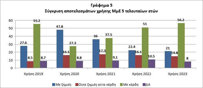 Με βάση τα ευρήματα της έρευνας για τα αποτελέσματα χρήσης των επιχειρήσεων το 2023 (κέρδη ή ζημίες) η κατάσταση παρουσιάζεται εμφανώς βελτιωμένη σε σχέση με τα προηγούμενα έτη και ιδιαίτερα εκείνα της υγειονομικής κρίσης. Όπως φαίνεται στο Γράφημα 5, το 56,2% των επιχειρήσεων δήλωσε ότι είχε κέρδη το 2023, έναντι του 21% που δήλωσε ζημίες και του 14,8% που δήλωσε πως δεν είχε ούτε ζημίες, ούτε κέρδη.