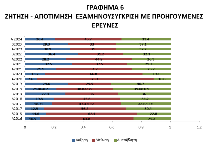 Η ζήτηση το πρώτο εξάμηνο του 2024 υπολείπεται σημαντικά ολόκληρου του 2023, με μόλις 1 στις 5 επιχειρήσεις (20,4%) να δηλώνει αύξηση της ζήτησης, έναντι περίπου των μισών επιχειρήσεων (45,7%) που δηλώνουν μείωση της ζήτησης.