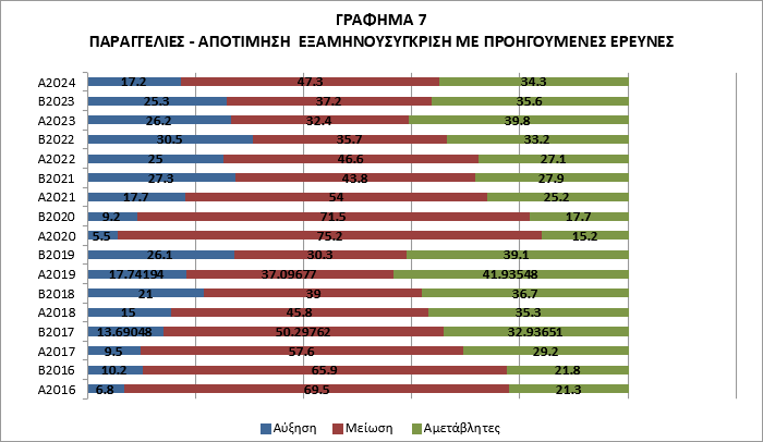 Για το πρώτο εξάμηνο του 2024 καταγράφηκε αύξηση των παραγγελιών μόλις για το 17,2% των επιχειρήσεων και μείωση των παραγγελιών για το 47,3%.