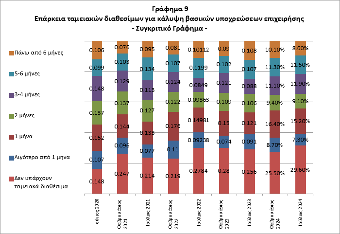 Περισσότερες από τις μισές επιχειρήσεις δεν έχουν (29,6%) ή έχουν το πολύ για ένα μήνα (22,5%) ταμειακά διαθέσιμα, αντικατοπτρίζοντας το πρόβλημα ρευστότητας που αντιμετωπίζει ένας αρκετά μεγάλος αριθμός μικρών και πολύ μικρών επιχειρήσεων.