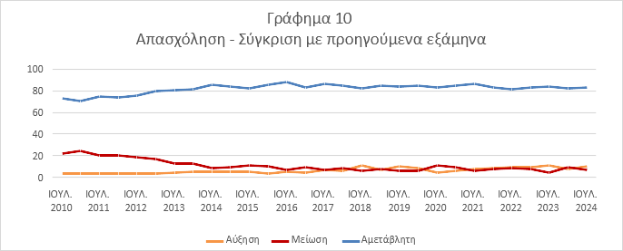 Στην απασχόληση το ισοζύγιο των επιχειρήσεων που μετέβαλαν το προσωπικό τους παρέμεινε θετικό. Συγκεκριμένα, το πρώτο εξάμηνο του 2024, οι επιχειρήσεις οι οποίες δήλωσαν ότι αύξησαν το προσωπικό τους αντιστοιχούν στο 10,3%, έναντι 6,6,% που δήλωσε ότι το μείωσε.