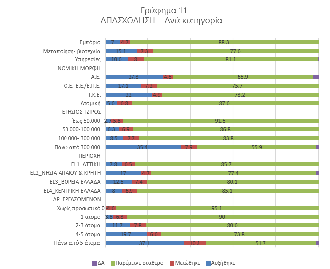 Οι επιχειρήσεις με κύκλο εργασιών άνω των 300.000 € και άνω των πέντε (5) ατόμων προσωπικό συνεχίζουν να παρουσιάζουν τη θετικότερη σχέση αύξησης/μείωσης εργαζομένων.