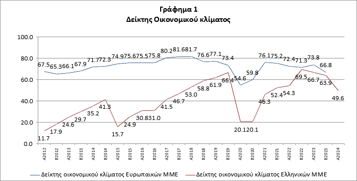 Ο Δείκτης Οικονομικού Κλίματος των μικρών και πολύ μικρών επιχειρήσεων παρουσιάζει σημαντική επιδείνωση, υποχωρώντας κατά 14,3 μονάδες σε σχέση με το προηγούμενο εξάμηνο. Συγκεκριμένα, διαμορφώνεται στις 49,6 μονάδες από τις 63,9 που ήταν το Β΄εξάμηνο του 2023